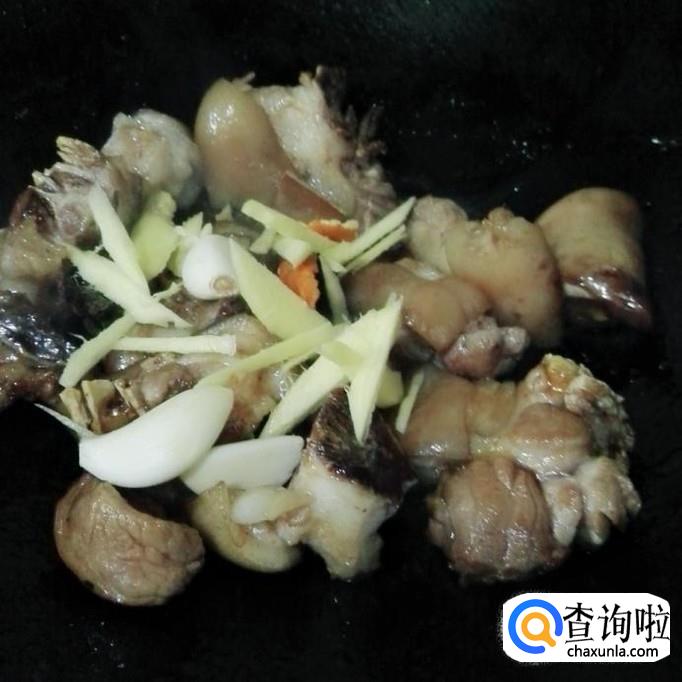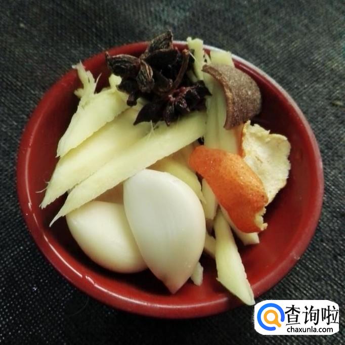 把大蒜去皮,生姜去皮切成丝,再准备一小片陈皮,如果有草果加上一粒草果更好。