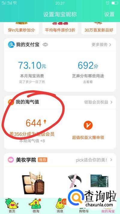 进入“我的淘宝”页面;再点下“淘气值”这里,如下图所示,这里注意了,修改淘宝会员名,要“淘气值”达到2000分才开放修改入口。