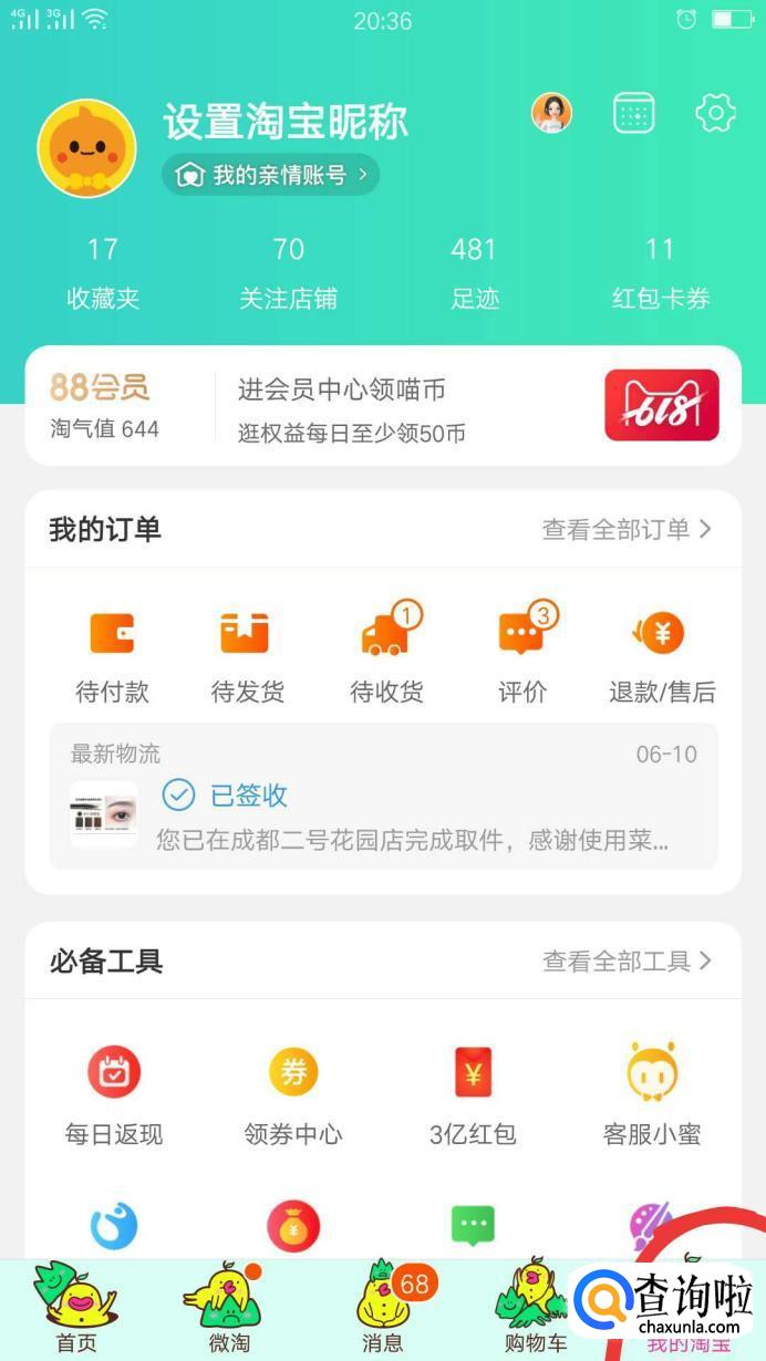 手机登录自己的淘宝;然后,在淘宝首页右下角点下“我的淘宝”。