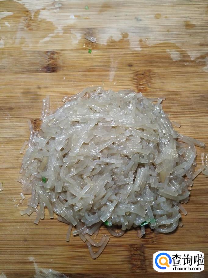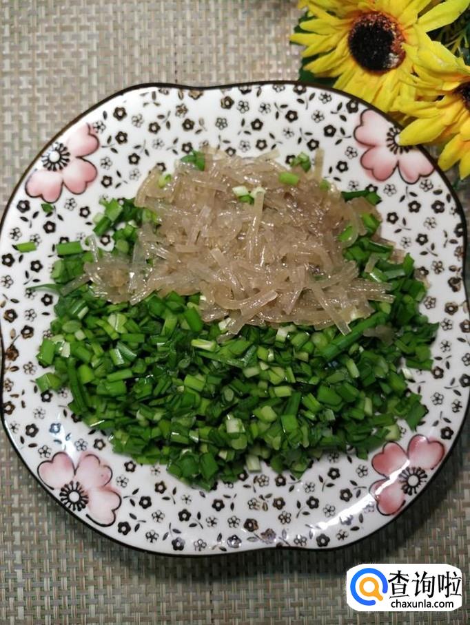 准备适量粉条,泡发后,和韭菜放在一起备用,粉条尽量切得碎一些,这样包煎饺的时候不容易露馅。