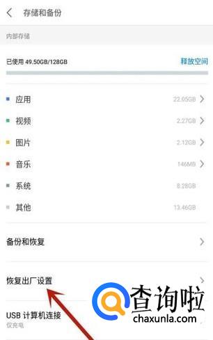 如果上面的方法都不可以的话,还可以利用“恢复出厂设置”,操作路径为,设置——存储和备份——恢复出厂设置