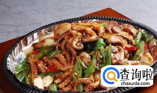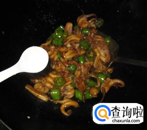 在另一口锅里(也可将锅洗净)倒入食用油,等待油冒烟后放入姜片爆出香味。然后倒入焯好的八爪鱼进行翻炒。