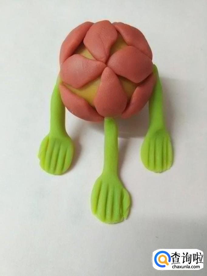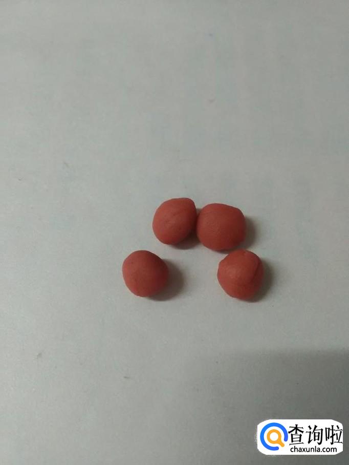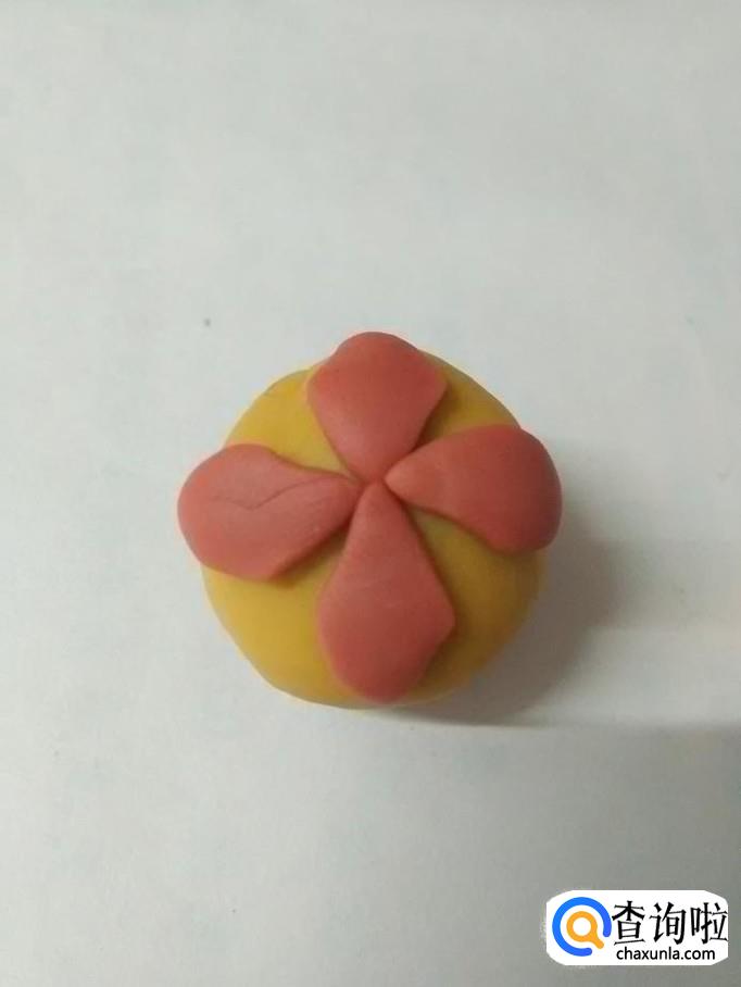 把四个圆球捏成四个菱形的花瓣,捏的时候,两端用拇指和食指挤一下,就成了花瓣的尖。