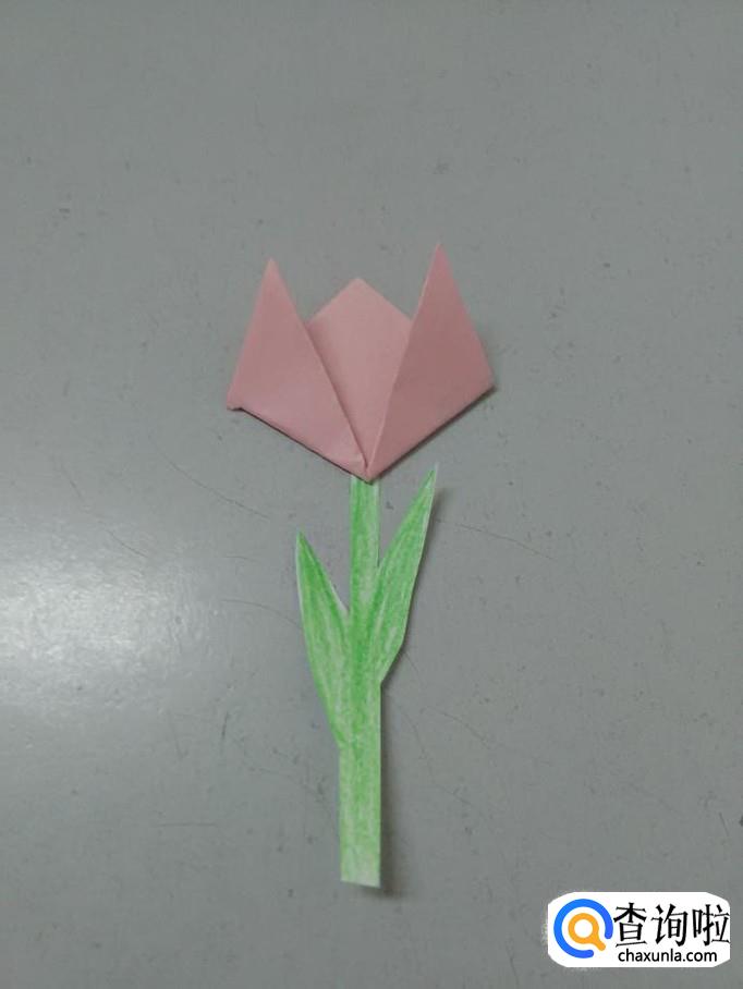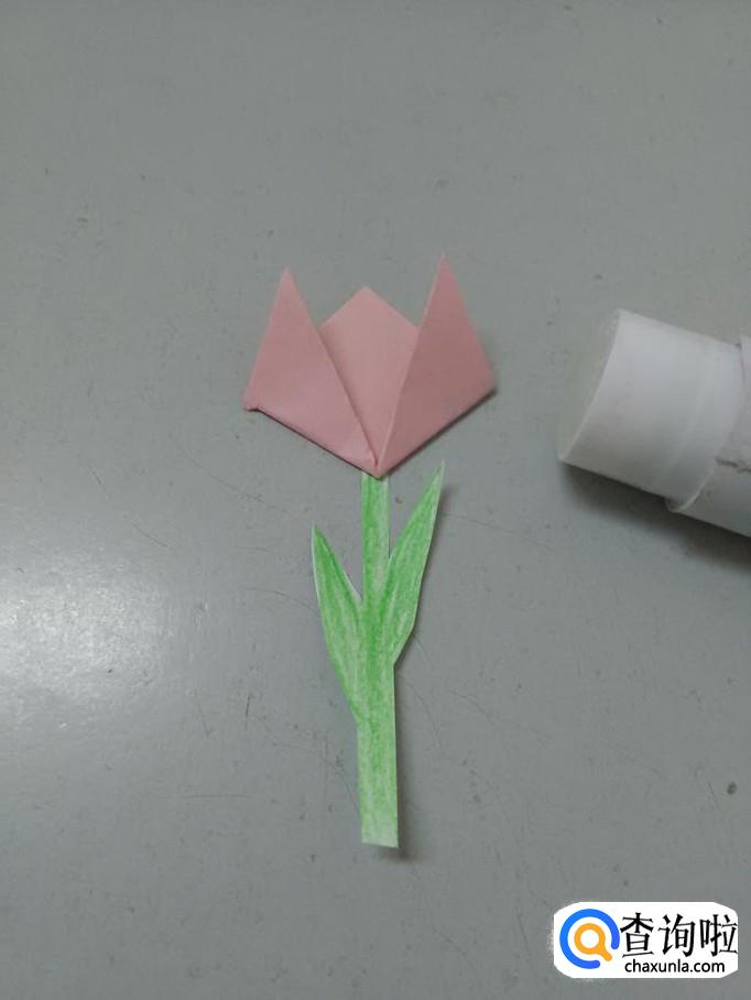 用胶棒把花茎和花朵粘在一起,一朵漂亮的郁金香花就做完了。
