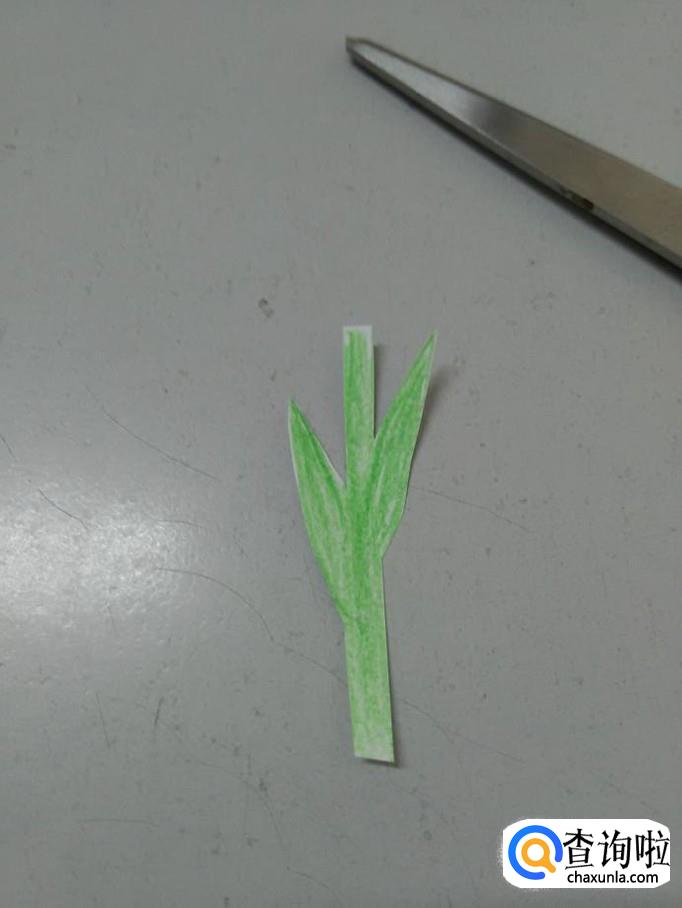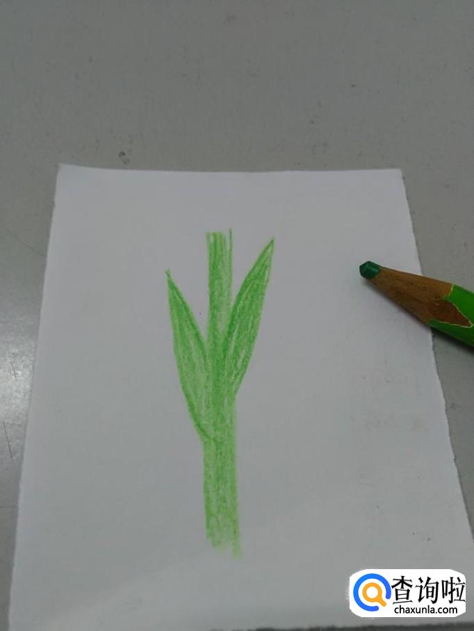 用绿色彩笔在白纸上画出花茎和叶子,叶子要画成又长又细的。