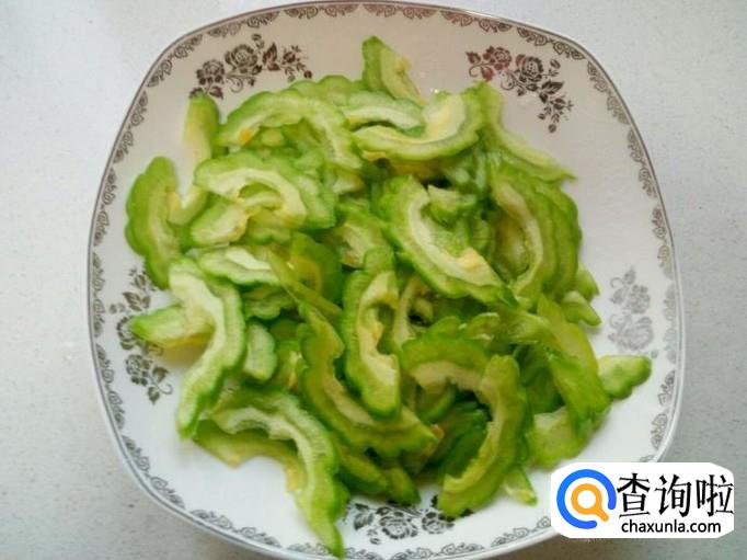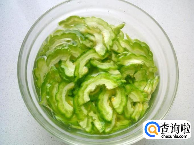 苦瓜用水清洗干净,去瓤,用刀切成片,放入水中浸泡,去除苦味。然后用水冲洗一下,控干水分。