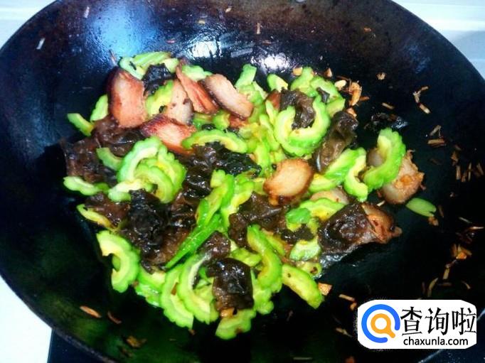 木耳炒至变软,透明,放入苦瓜翻炒,放入盐。