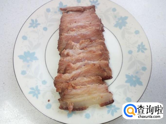 事先煮好的腊肉,用刀切成片(如果腊肉比较硬,就先用水煮一下,我这是刚煮好的腊肉,所以比较软)。
