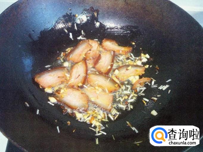 锅内放入油加热,油热后放入花椒爆锅。放入腊肉翻炒,放入料酒。