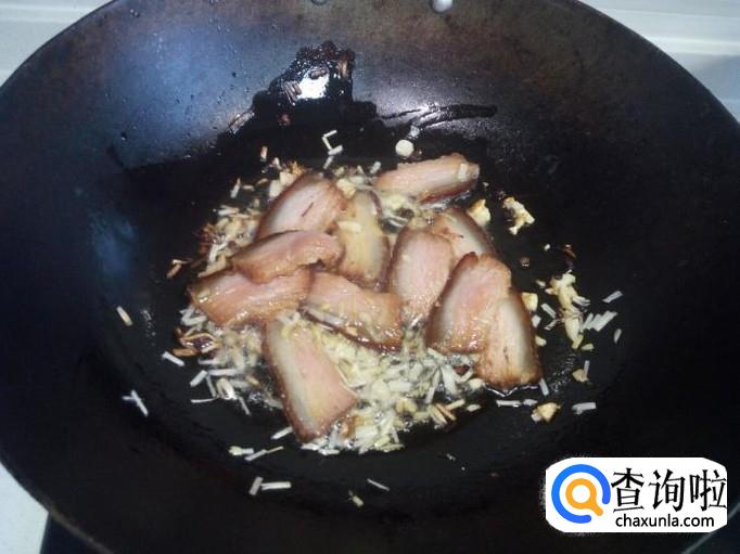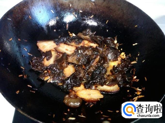 炒至腊肉透明,发亮光,放入木耳快速翻炒。
