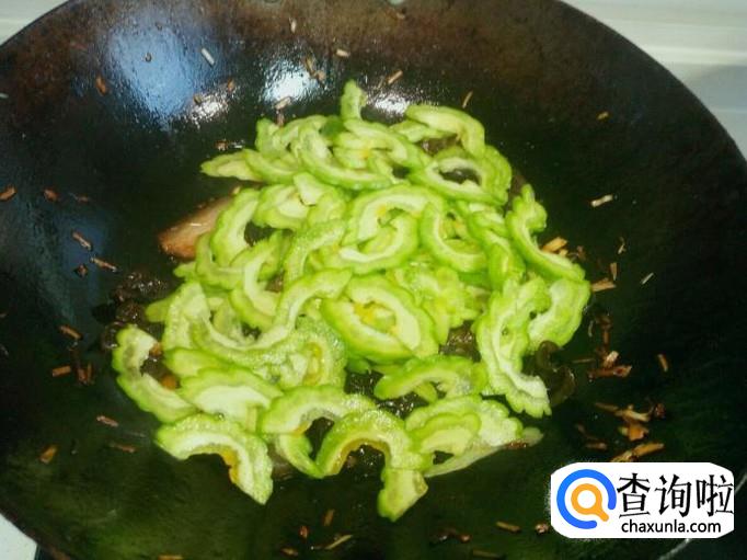 苦瓜炒至断生即可,放入味精,关火出勺。