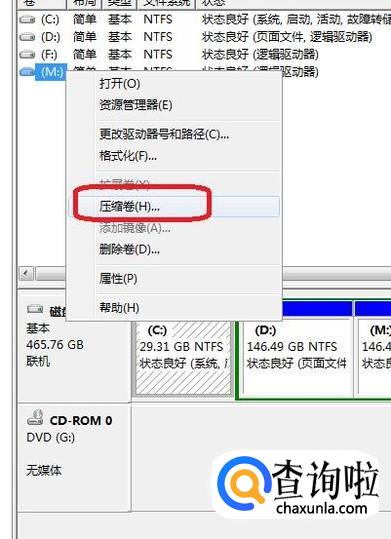 我们选择一个剩余空间较多的盘,来演示分出一个新的磁盘。如图所示,我们选择M盘,右键单击,选择“压缩卷”。