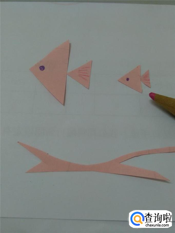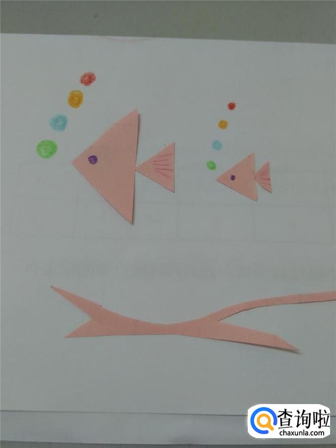 把最大的一个三角形用胶棒粘在纸的左边,当作大燕鱼的身体。