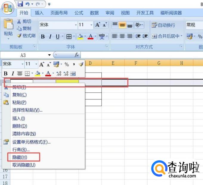 之后我们选中有黄色单元格的那一行,然后右击选择隐藏;