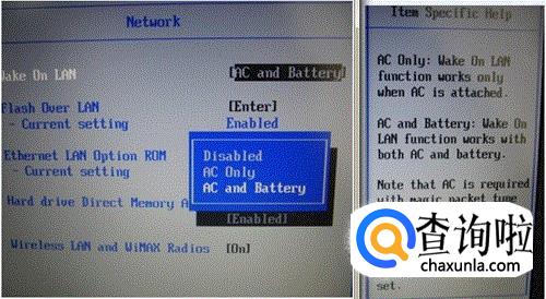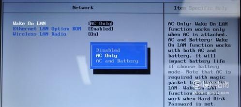 三个选项功能分别是“网络唤醒功能”“网络引导功能”“无线网卡功能”。“wake On Lan”中的“AC Only”即只连接电源情况下启用。“Wireless Lan Radio”设置为“ON”即启用无线网卡。