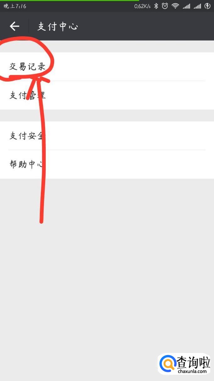 点击小图标进入界面后,第一个选项会出现“交易记录”的选项,点击该选项进入下一个界面,你就会看到你各种方式的交易记录,你想查看你的历史红包记录,那就随便找到一条红包交易的记录,然后点击进去。