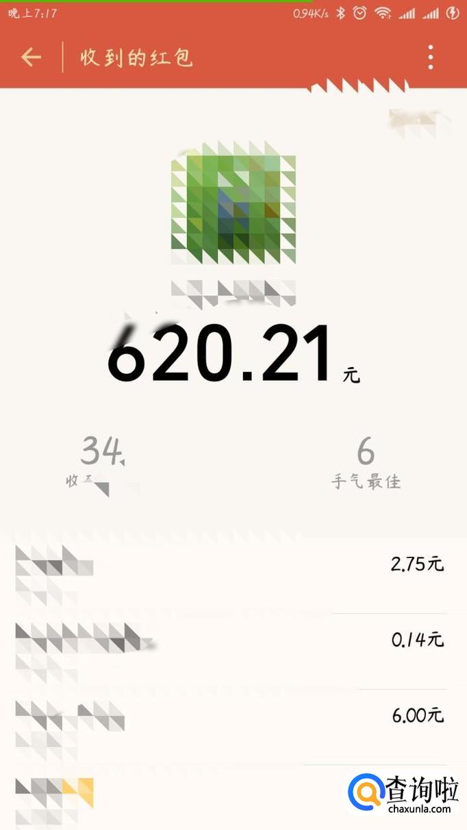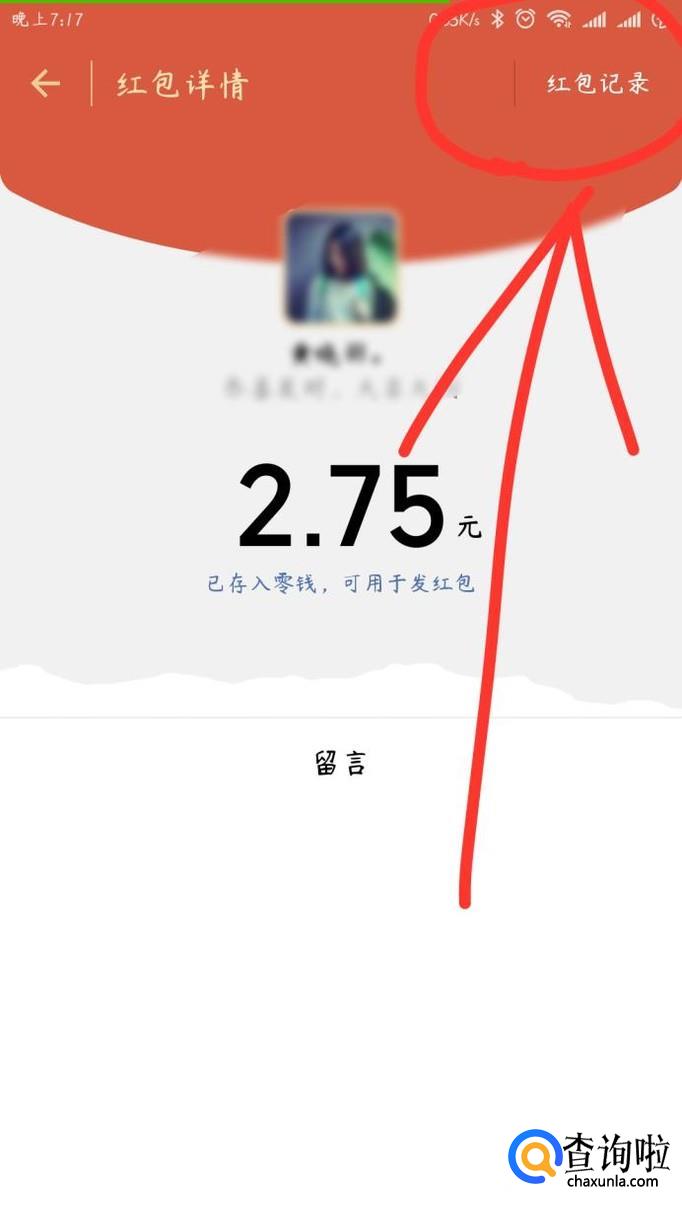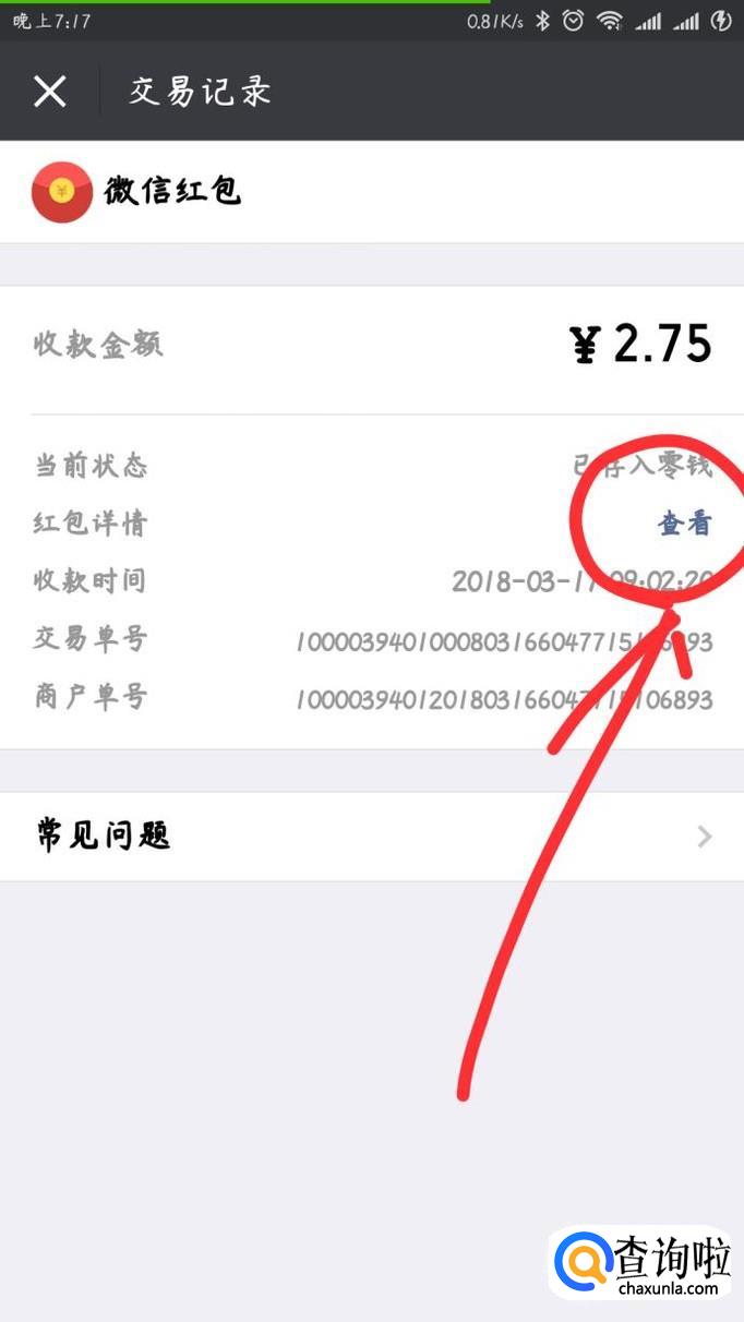 点击之后进入下一个界面,会出现你所点击的红包的详细交易记录,然后点击上面的“查看”字样,又进入下一个页面。你将会看到该界面的右上角有“红包记录”的字样,然后点击,又进入下一个界面。