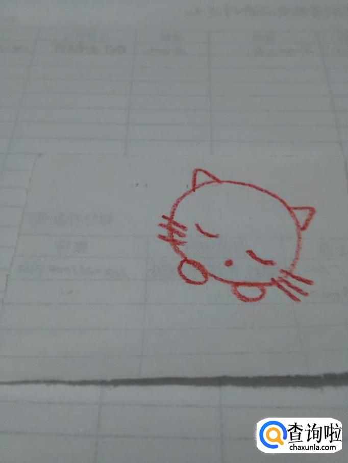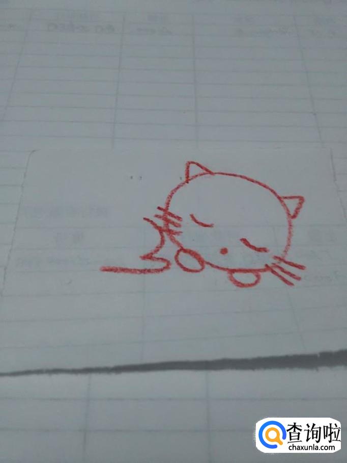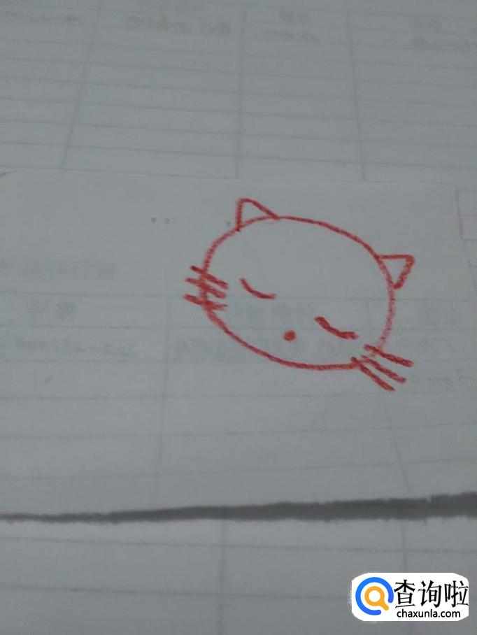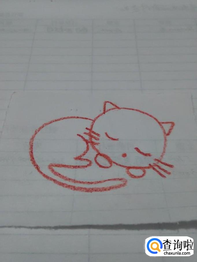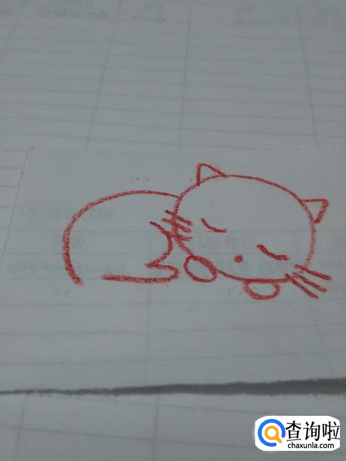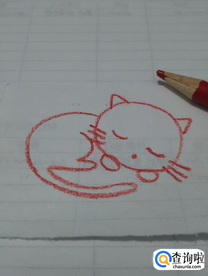 在小猫的脸上画两条弧线,表示闭着的眼睛,在眼睛下面画一个红点,表示嘴。