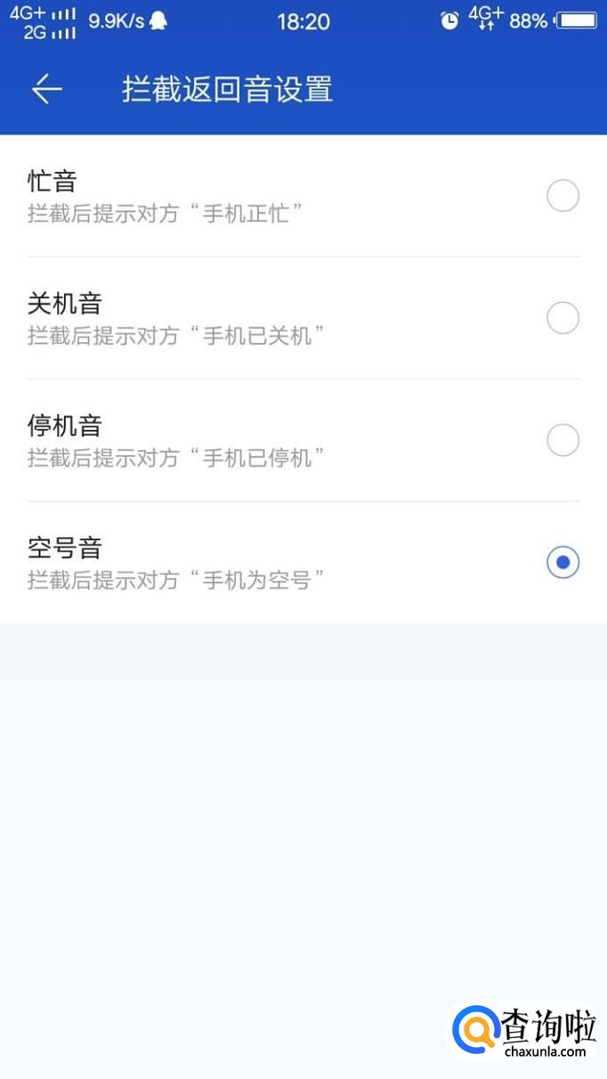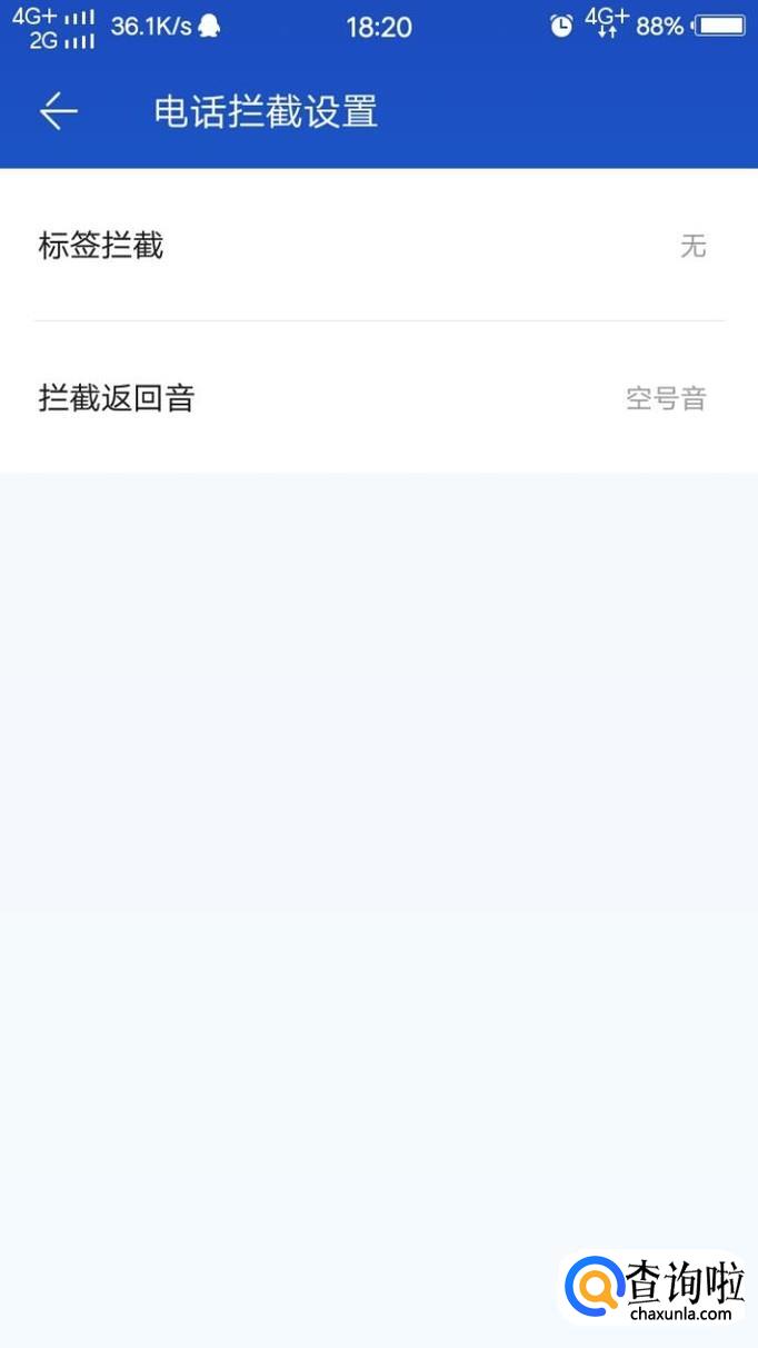 紧接着,点击“电话拦截设置”,进入以后,再点击“拦截返回音”。