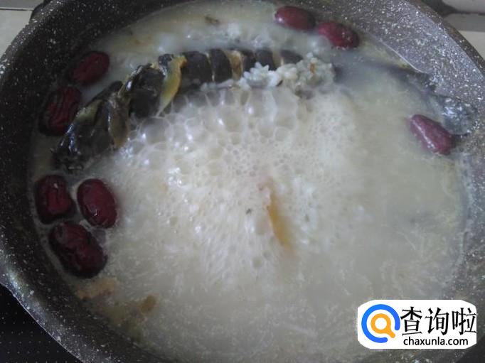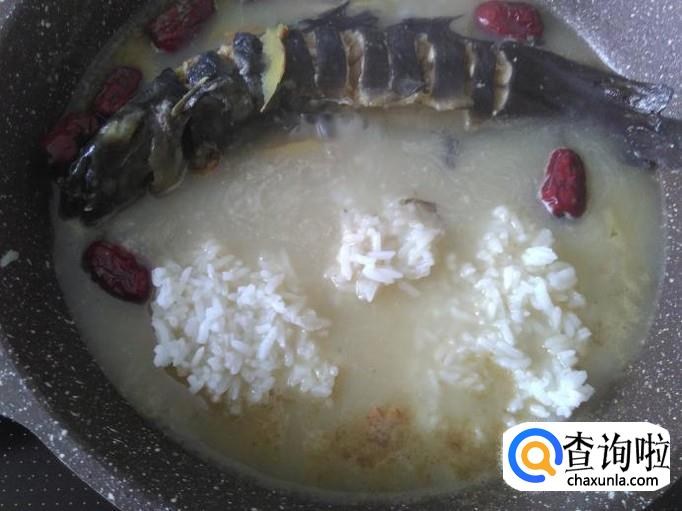 汤水变奶白色后,加适量煮好的白饭进去。