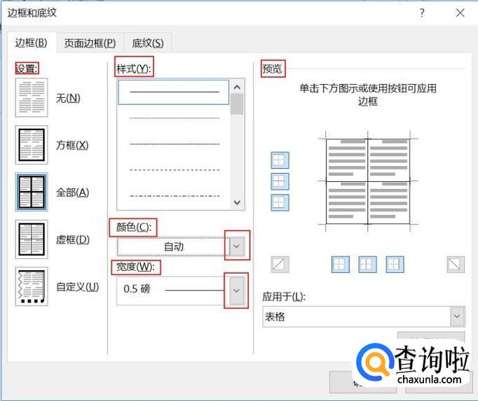 点击“边框和底色”即可弹出边框与底色对话框。