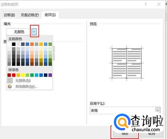然后设置底纹,选中所需颜色,点击“确定”,回到主对话框,继续点击“确定”。