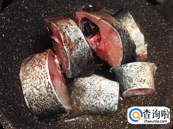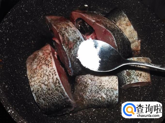 开火下油,把鱼块摆到锅里,撒适量的盐用小火煎。
