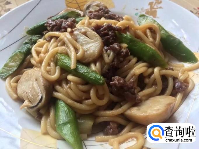 蚝油芦笋草菇牛肉意面,意面煮到软后捞起备用,锅中倒入适量油,倒入草菇翻炒后再倒入芦笋翻炒至变色,倒入意面一起翻炒,最后加入牛肉炒到牛肉变色后加入蚝油生抽炒匀即可