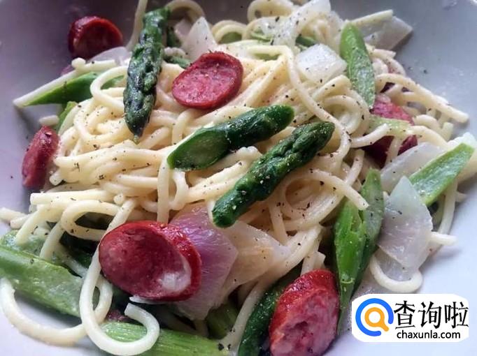 香肠芦笋洋葱意面,香肠切片,煎至两面金黄色盛起备用,意面煮到软后捞起备用,锅中倒入适量油,油热倒入洋葱爆香后倒入芦笋翻炒,再放入香肠和意面一起翻炒之后加入生抽,蚝油调味即可,盛起后撒黑椒粉即可