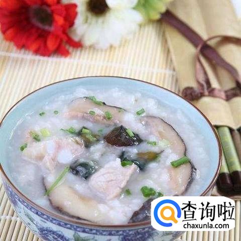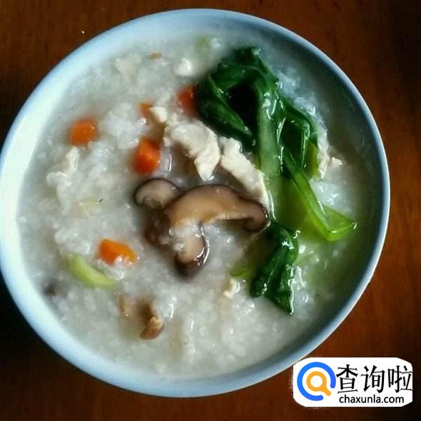 将米煮至软烂,放入香菇、青菜、鸡肉,接着煮5分钟左右,关火起锅。