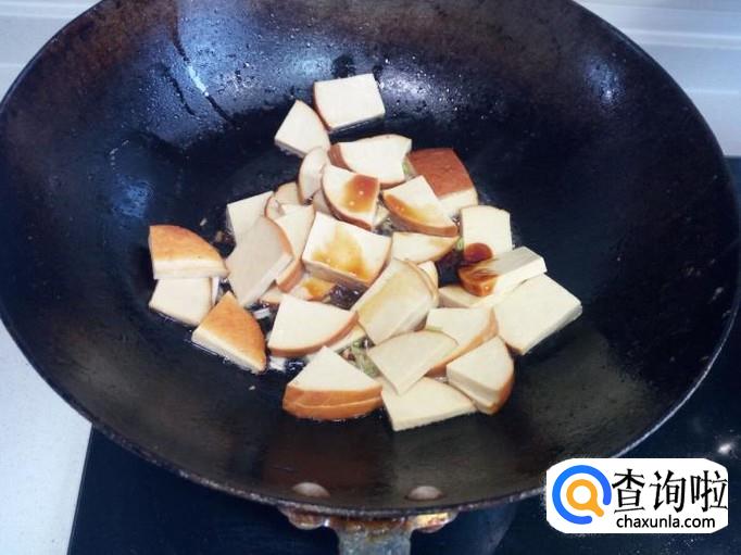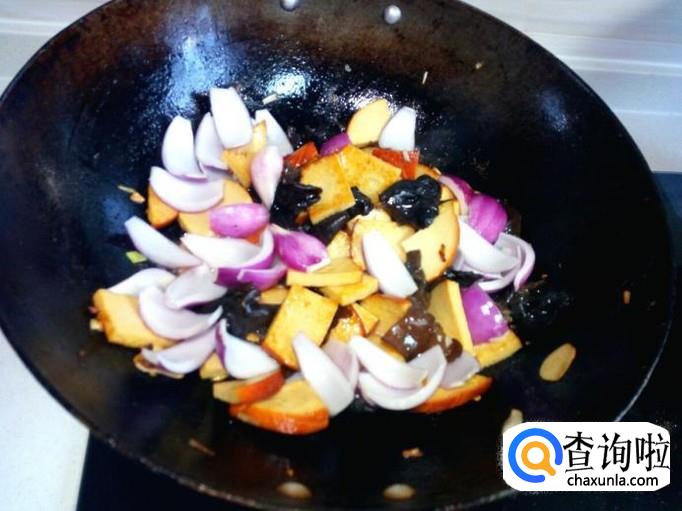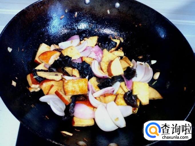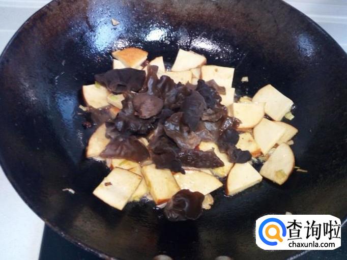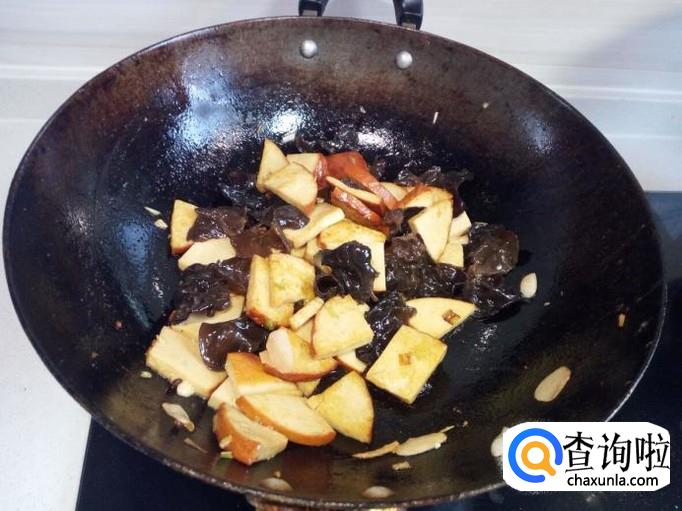炒至素鸡变软,放入木耳翻炒。