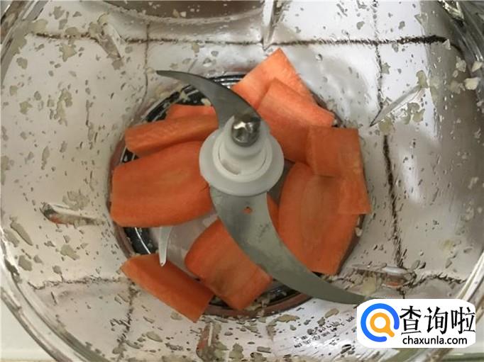 处理红萝卜。红萝卜先去掉表面的皮,然后清洗干净,接着将萝卜切成几块,小块一点,这样才能让萝卜更好地被绞碎成末,也是用绞肉机绞,这样能节约很多时间。