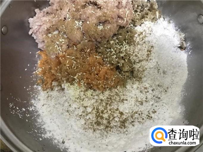 搅拌均匀。接着将猪肉洗好,切成块状,然后放入绞肉机中绞碎,接着倒出来,然后和红萝卜、香菇、蒜头和地瓜粉,放入适量的水,再加入盐、鸡精、花椒粉,搅拌均匀即可。