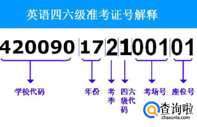 四级准考证号共15位数字,前6位是学校的代码,接着的2位是年份,1位是考季,1位是四六级代码,3位是考场号,2位是座位号。