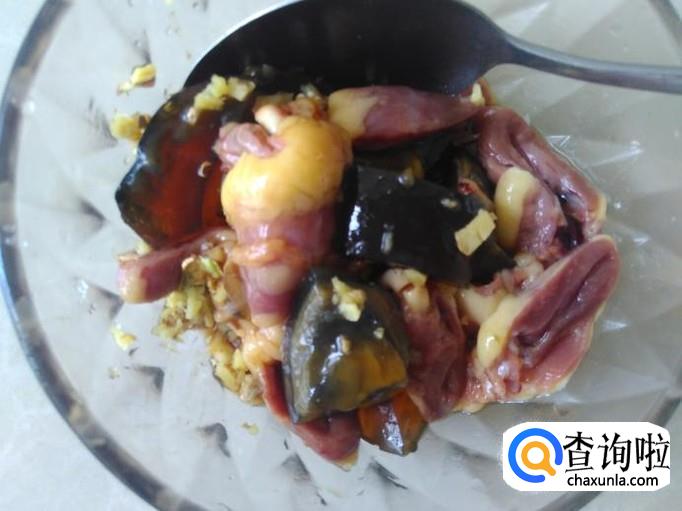 鸡心皮蛋混合一起,加适量的盐、姜蓉、1勺生抽、1勺料酒。