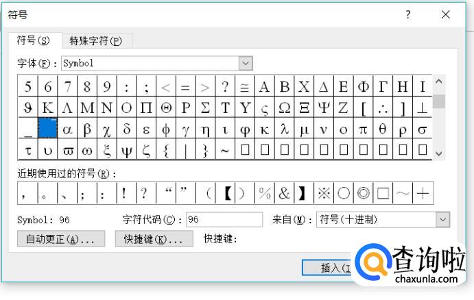 在“symbol”字体中,我们一个上划线的符号,在word2010文档里位置位于符号α前面,点击插入。