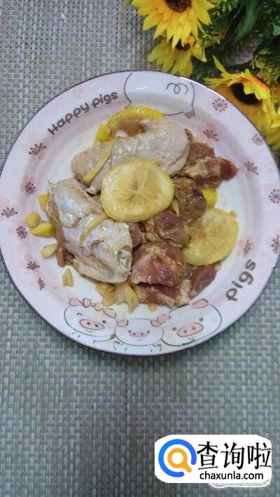 准备适量鸡翅和排骨,洗净后,放入盐,料酒,老抽,生姜,奥尔良腌料,再准备适量柠檬,切成片后再切成小丁儿,放入盘中腌制2个小时。