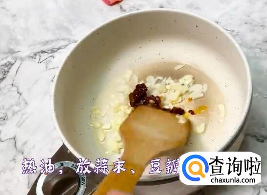 另起一锅,放油,油热后放入蒜末、豆瓣酱炒香。