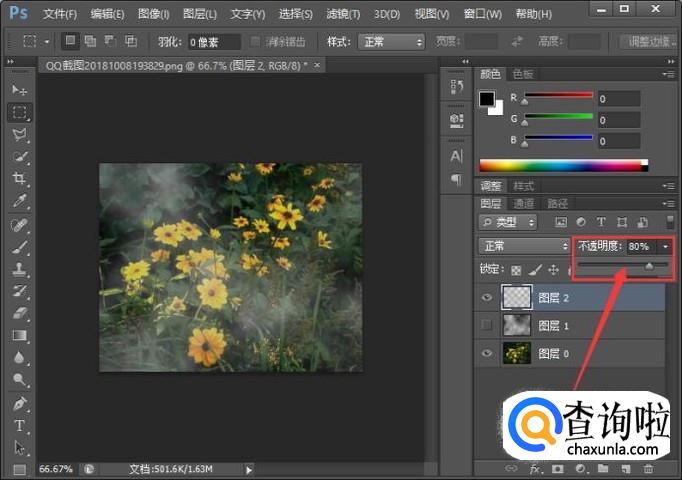若你认为烟雾浓了,可以点击不透明度,将不透明度调节小,照片的烟雾效果就出来了。