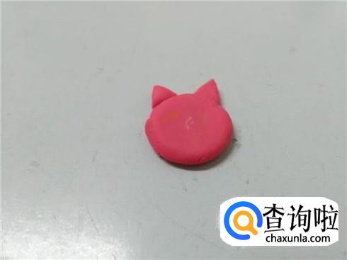 先将一团粉色橡皮泥团成圆球,再按成扁片儿。当做小猫的头。