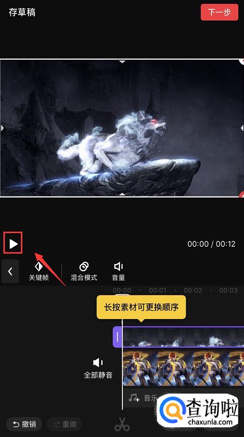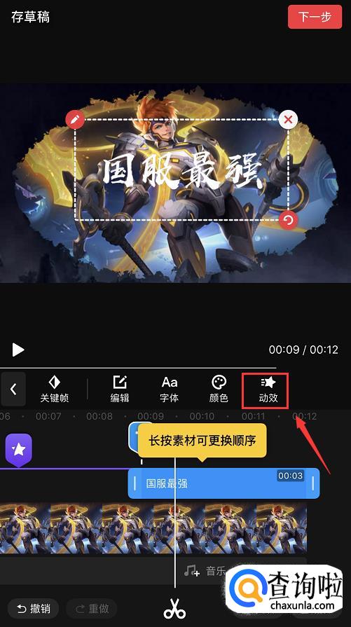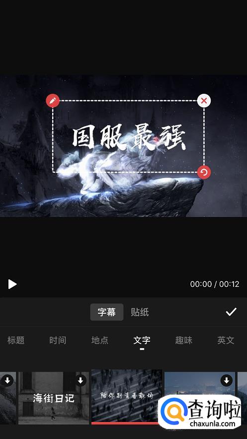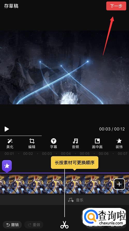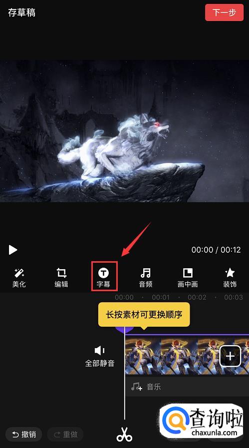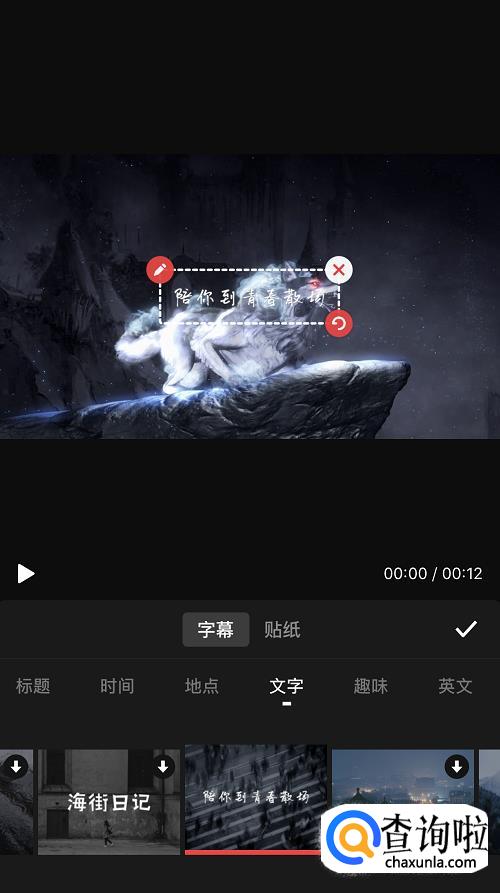 选好后进入编辑页面,点击素材,将其拖动至12秒的位置。