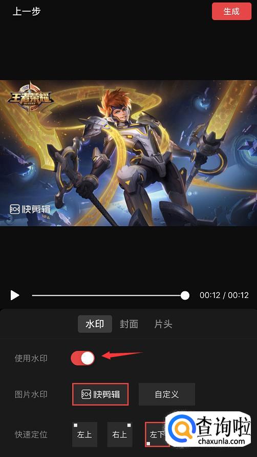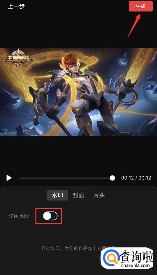 然后在保存页面将“使用水印”后面的按钮关闭,然后点击右上角的【生成】。
