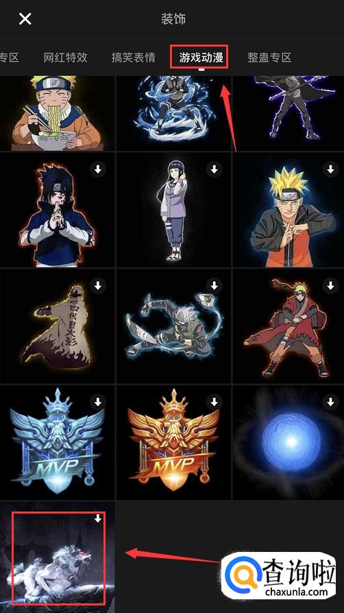 来到装饰商城,在上方的类型中点击【游戏动漫】,然后下滑到底部,选择王者荣耀特效。