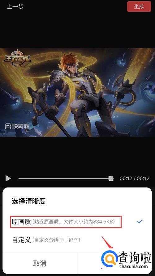 点击后,页面下方会弹出“选择清晰度”的弹窗,这里我们选择【原画质】,点击右下角的【生成】。