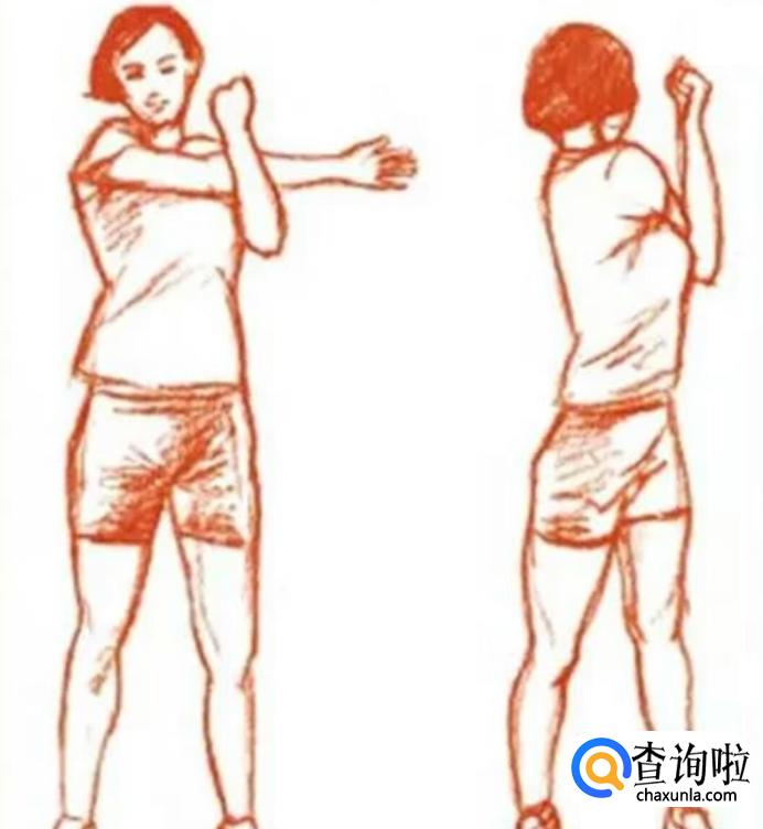 一只手朝头上伸直,弯曲手肘,手掌触碰肩胛骨,另一只手握住手肘部位并往一侧拉,身体同时向相同方向倾斜,左右交替进行。