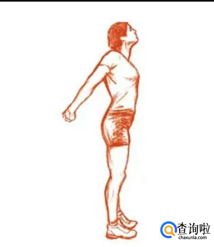 两手放在背后交叉互握,身体向后方伸展,并将胸部挺起。