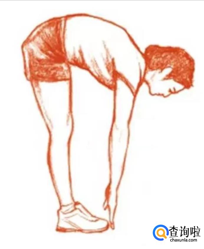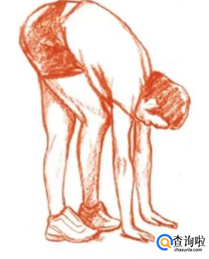 双脚并拢站好,将上半身向前倾。尽量用手去触碰地面,碰不到也没关系,膝盖保持伸直。