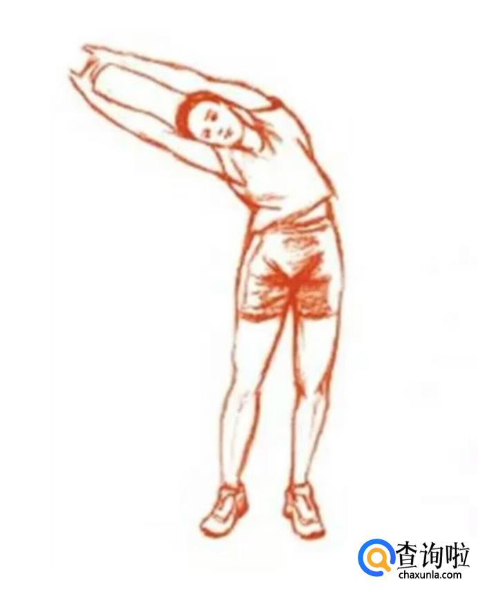 手臂向上伸直,双手互握,将身体弯向一侧,然后弯向另一侧,重复数次。