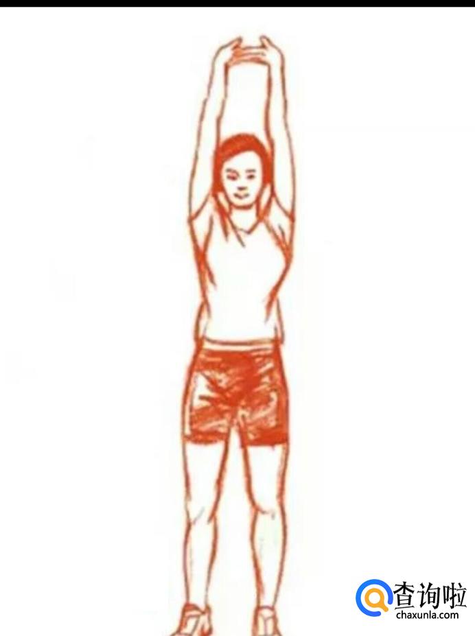 双手交叉互握,向头顶上方伸直,维持数秒。