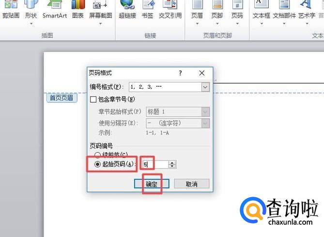 弹出的界面,我们点击起始页码,然后我们输入我们开始的页码,之后点击确定就可以了。